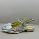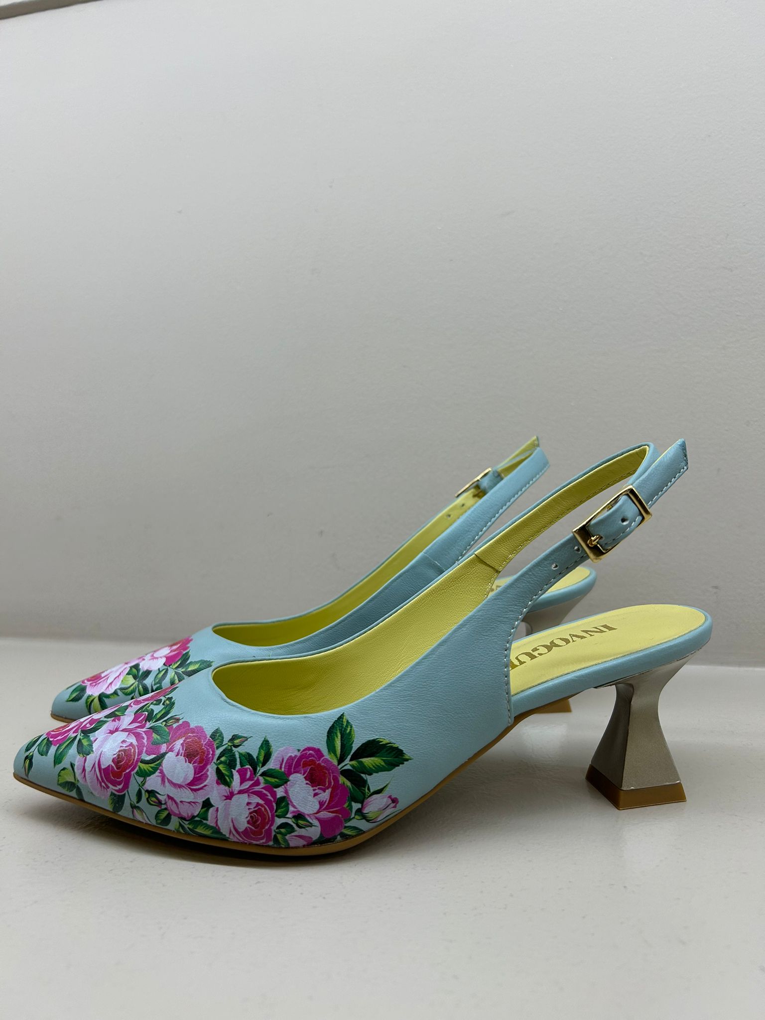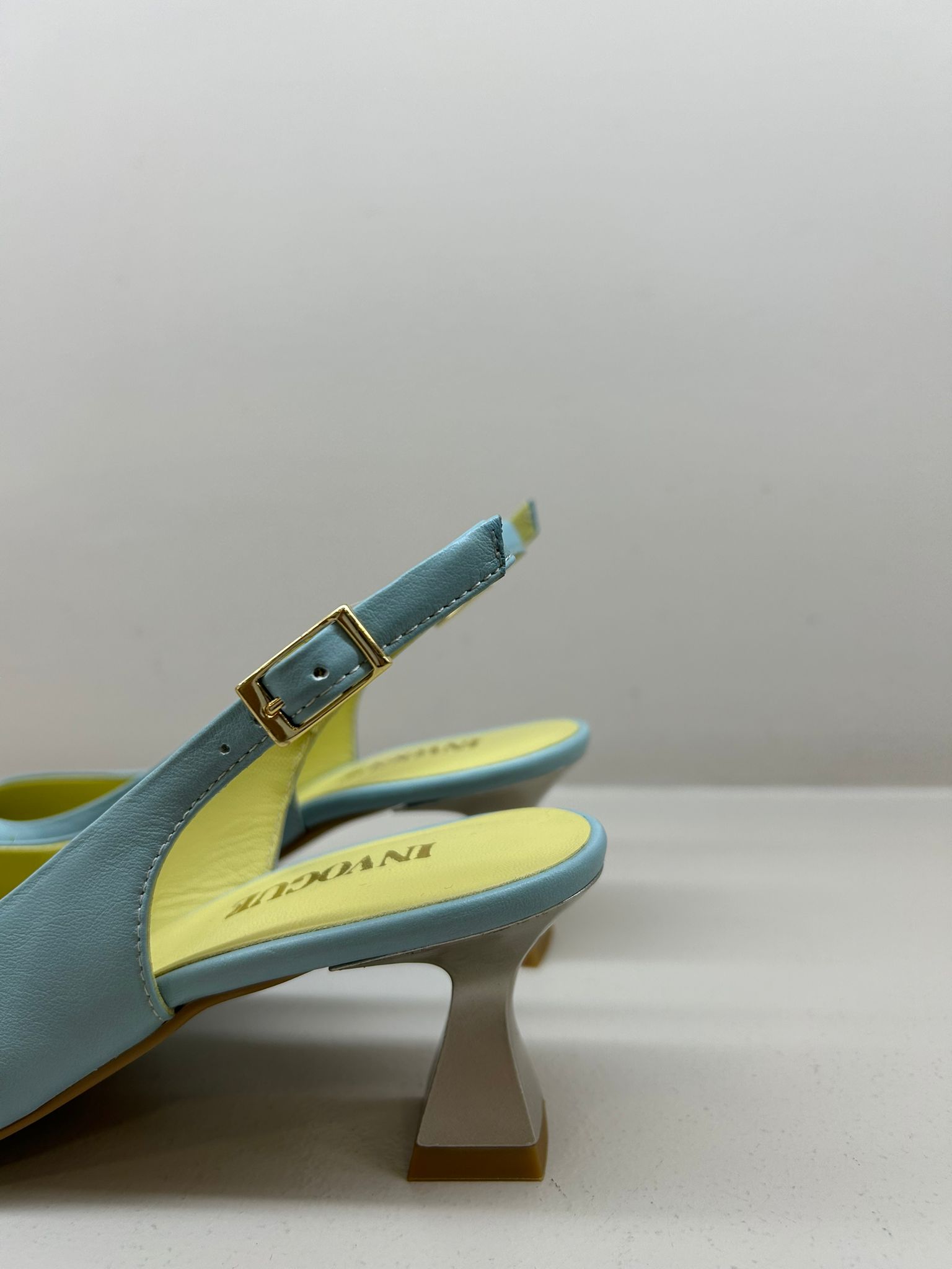 Sandália fechada a frente de meio salto.